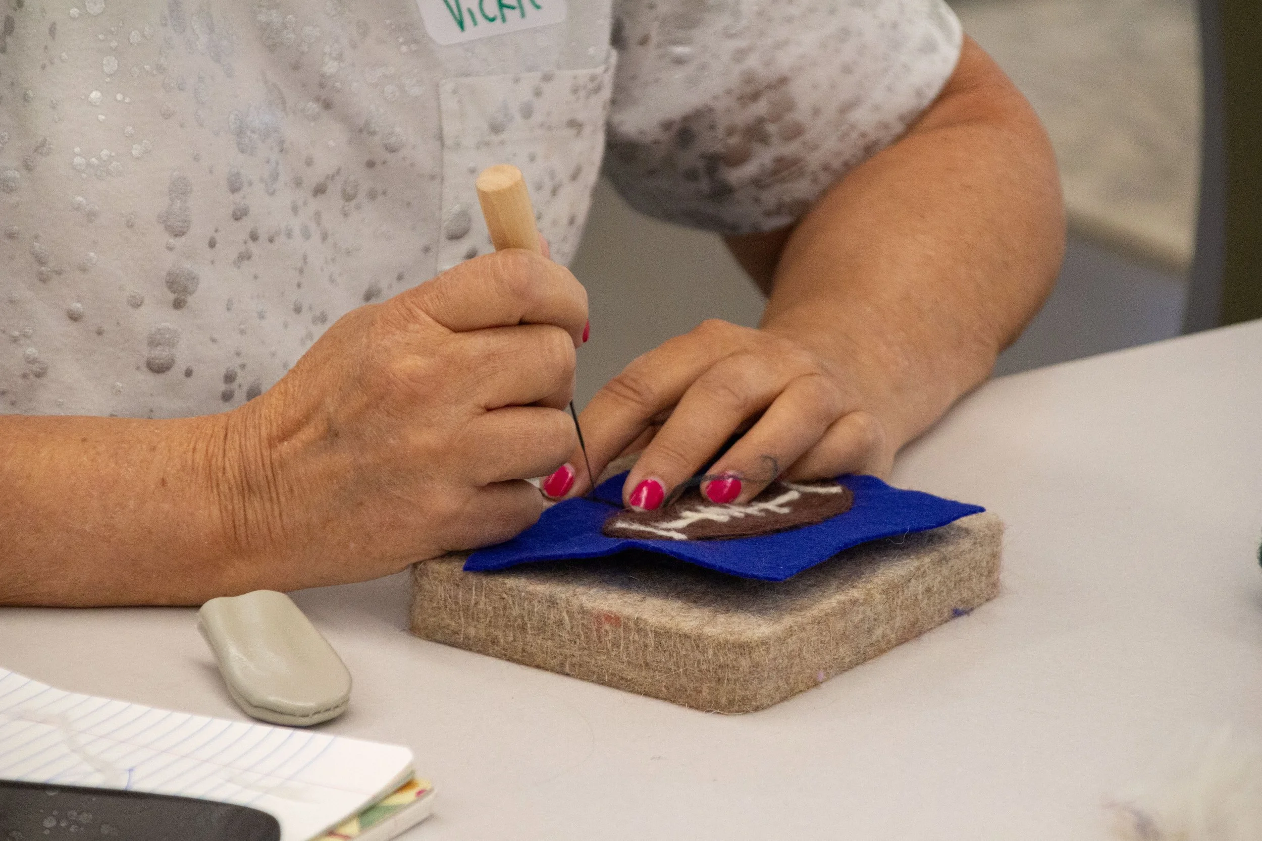 Through the weeks our group learned to needlefelt and completed several small projects, along with their collaborative mural. I asked participants to consider their past, present, and future when creating their pieces for our larger project. The first circle references their personal past, then present, then future. Each participant created one or more narrative pieces to add to the collective puzzle seen here.